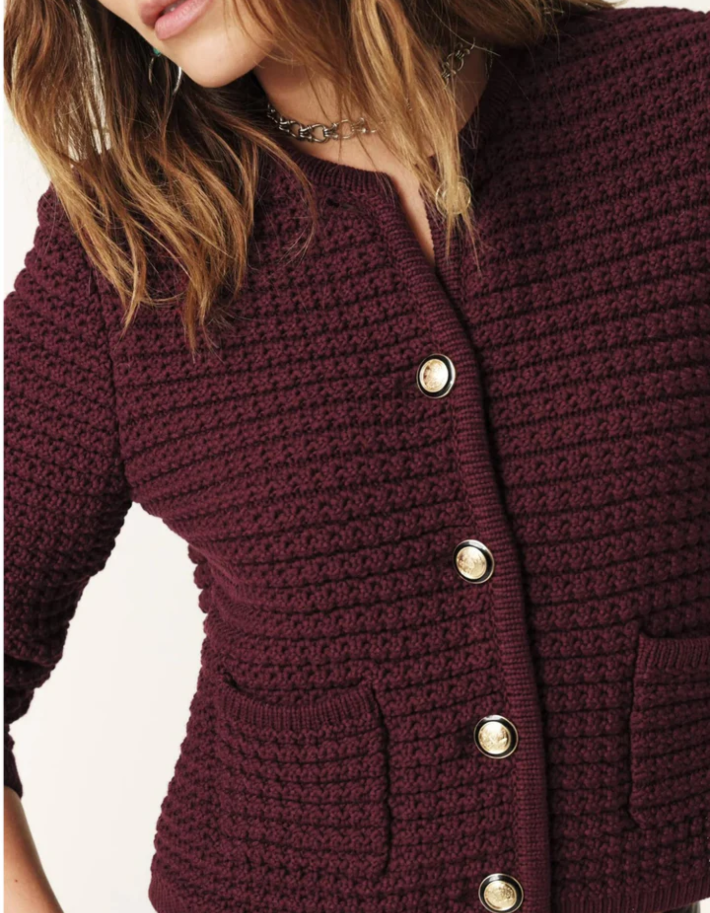 Wzbogać swoją garderobę o kardigan Adeline, wyróżniający się wyrafinowaną teksturą i złotymi guzikami. To idealna propozycja, która doda stylu i ciepła każdej stylizacji – od codziennych po bardziej eleganckie.