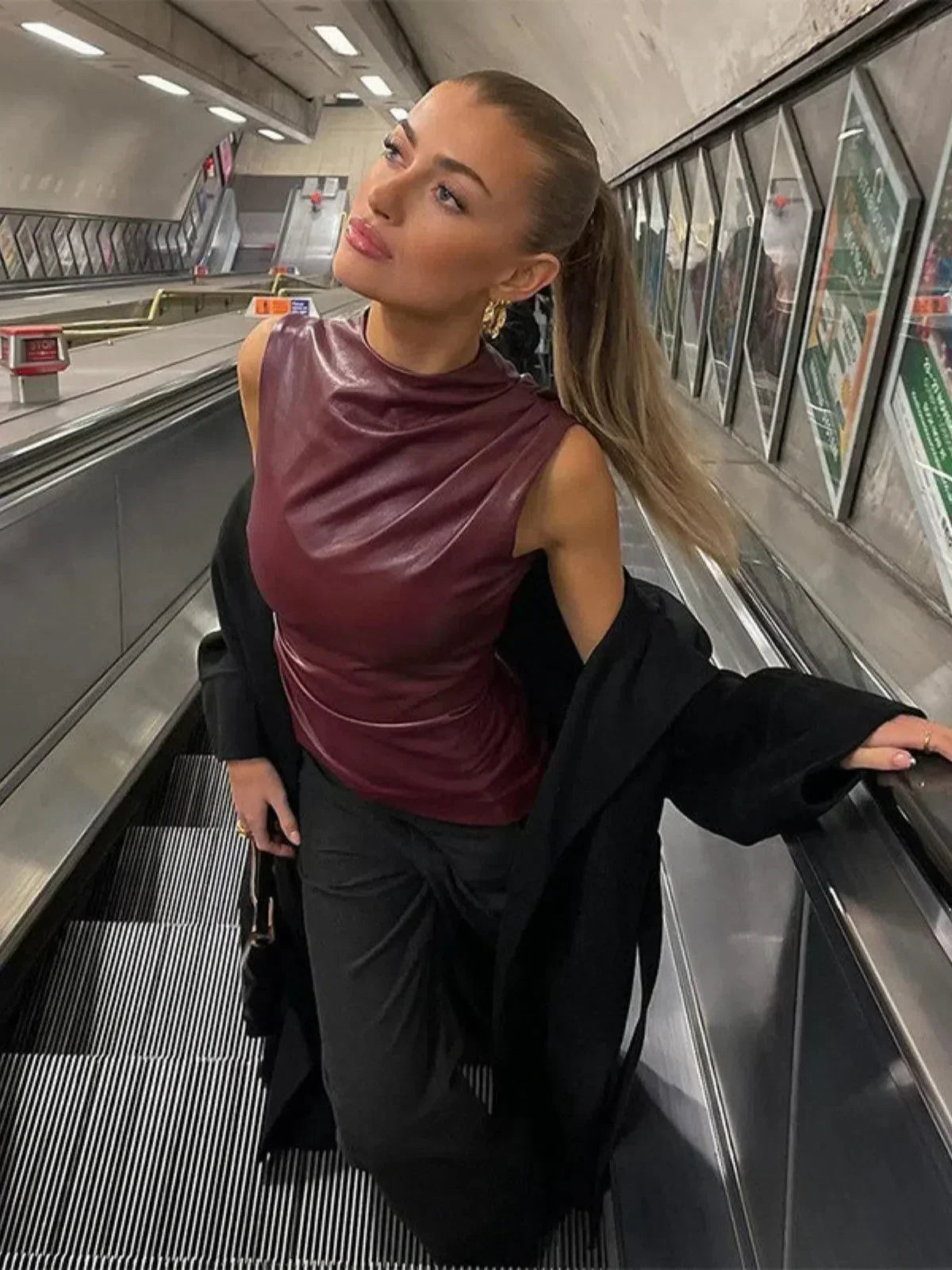Przyciągaj spojrzenia z bluzką Arietta – odważnym modelem z imitacji skóry, który łączy wyrazistą elegancję z nowoczesną formą. Wysoki dekolt i asymetryczny dół tworzą dopracowaną sylwetkę, a marszczenie w talii podkreśla figurę i nadaje całości strukturalnego charakteru. To śmiały, a zarazem wszechstronny element Twojej garderoby.