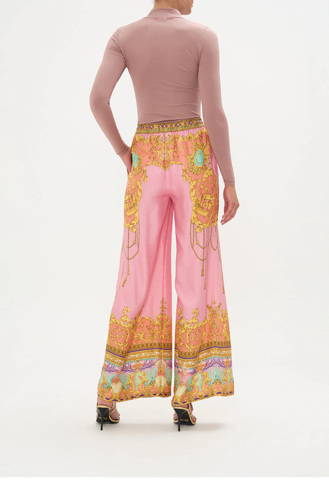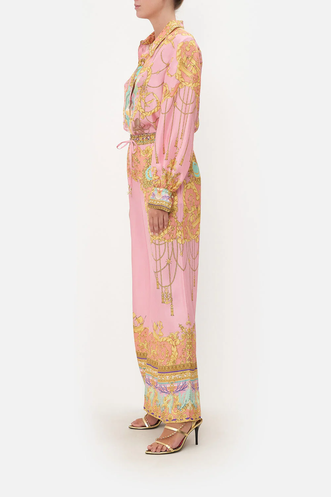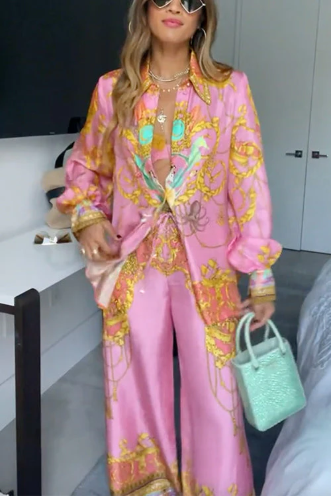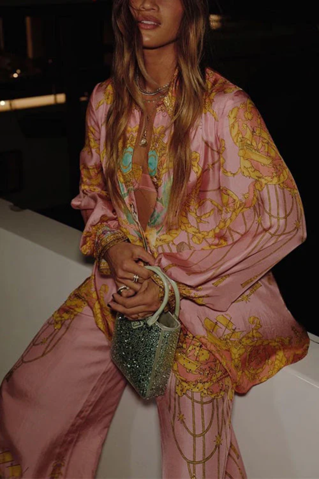 Zestaw Celinna łączy zachwycający, inspirowany barokiem print z delikatnym, różowym tłem, tworząc odważne, a jednocześnie eleganckie połączenie. Składający się z luźnych spodni z szerokimi nogawkami oraz koszuli zapinanej na guziki z misternym wzorem i regulowanym troczkiem w talii, zapewnia komfort i styl przez cały dzień. Idealny na eleganckie stylizacje od rana do wieczora.
