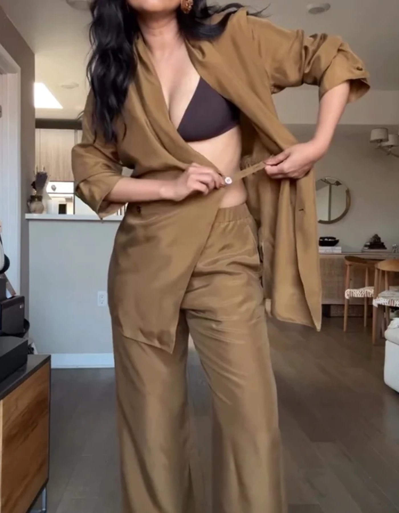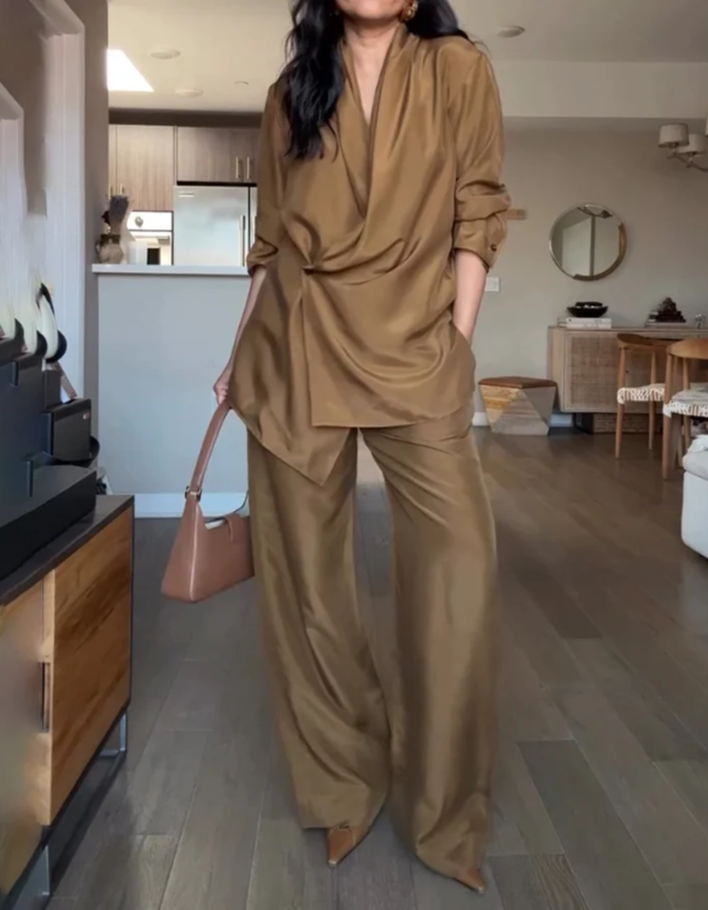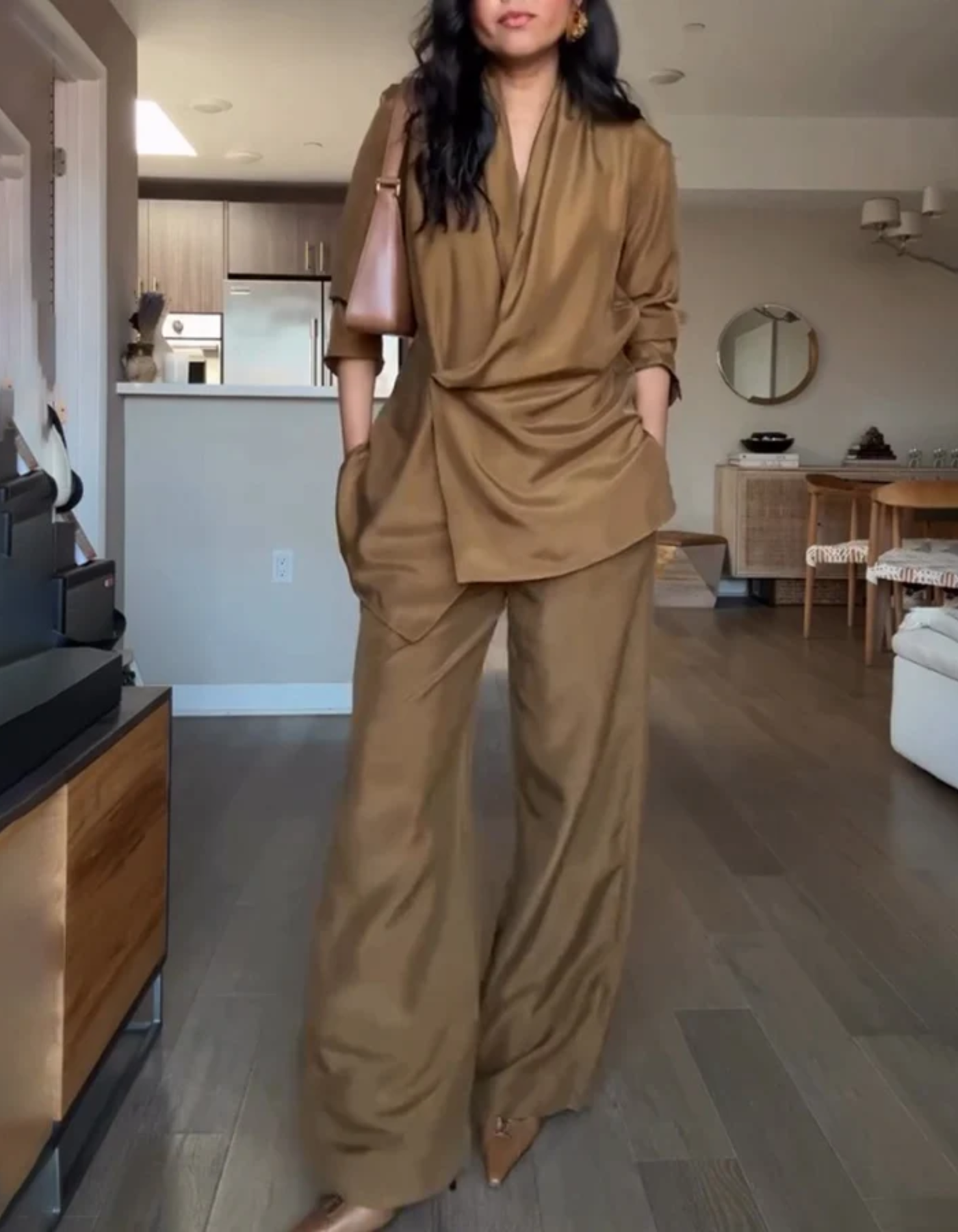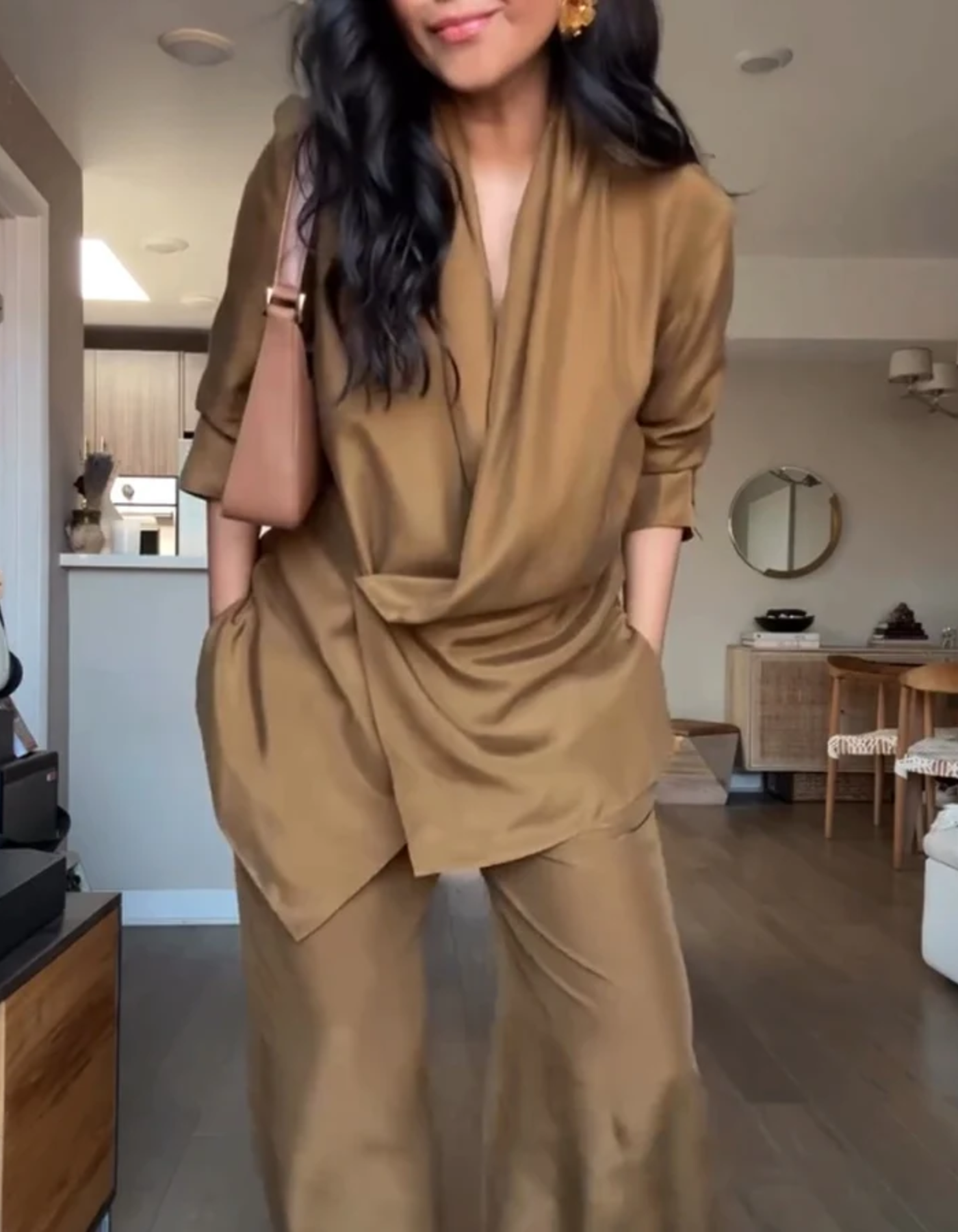 Zestaw Lorenzia to idealne połączenie wyrafinowanego komfortu. Składający się z topu w stylu kopertowym i luźnych spodni z szerokimi nogawkami, ten zestaw łączy bezwysiłkowy styl z nowoczesną elegancją. Miękka tkanina z drapowaniem tworzy sylwetkę, której zazdroszczą wszyscy, idealną zarówno na dzień, jak i wieczorne wyjścia.