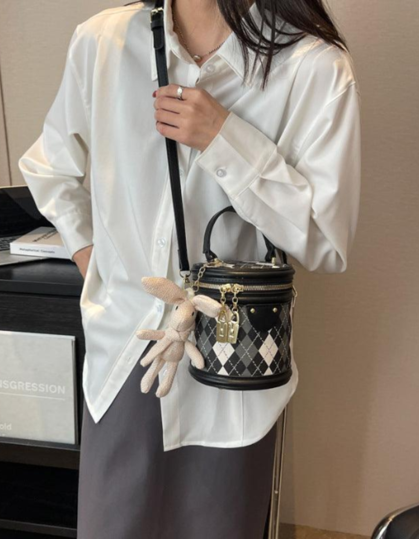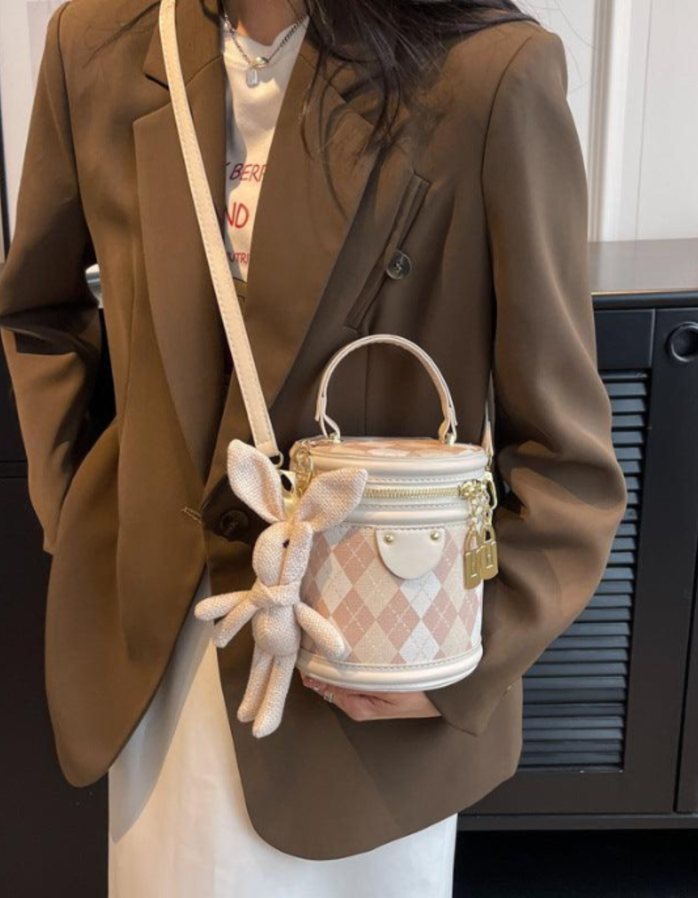 Słodka i usztywniona torebka na ramię Minivière wprowadza nostalgiczną nutę do Twojej stylizacji dzięki miękkiemu wzorowi w romby i zabawnemu pluszowemu brelokowi w kształcie króliczka. Idealna na dni, gdy chcesz połączyć klimat vintage z odrobiną zabawy.